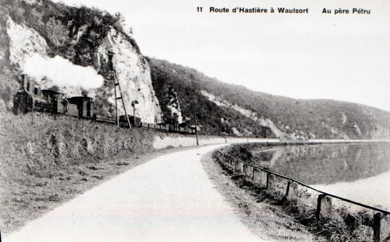Reproductie van een postkaart met als opschrift '11 Route d'Hastière à Waulsort Au père Pétru'. De postkaart toont een stoomlocomotief die enkele goederenwagens trekt. Rechts zien we de Maas.