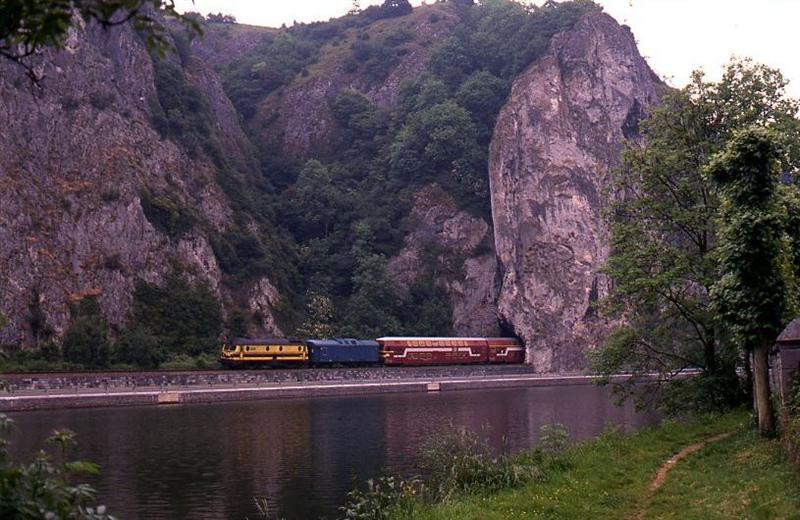 Deze fotogroep bevat 10 dia's. Een diesellocomotief van de reeks 59 rijdt met een reizigerstrein in de omgeving van Waulsort. De trein is samengesteld uit M 5-rijtuigen. Vlak achter de locomotief bevindt zich een generatorwagen. Deze wagens werden ingezet om elektriciteit te leveren aan reizigerstreinen gesleept door diesellocomotieven. Schenking van Myriam Hendrickx.