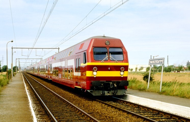 Een reizigerstrein bestaande uit een aantal M 5-rijtuigen komt aan in het station. Het eerste rijtuig is uitgerust met een stuurpost. Aan hun perfecte staat te zien zijn de rijtuigen pas geleverd. We hebben zicht op de perrons, de verlichting, een stationsnaambord en links op de achtergrond is een seinbaken te zien. Schenking van Myriam Hendrickx.