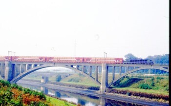 BeschrijvingDeze fotogroep bevat twee dia's. Elektrische locomotief 2004 rijdt met een sleep M 5-dubbeldekrijtuigen over een spoorbrug in Melle.