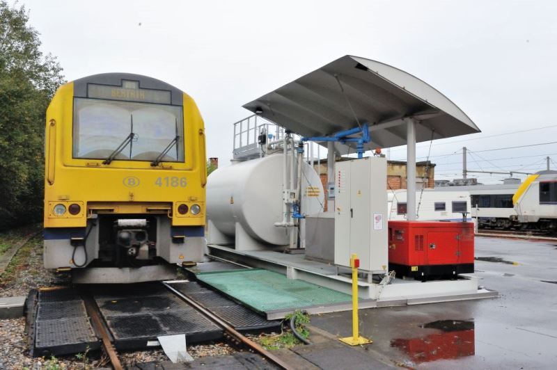 BeschrijvingDe groep bevat vier digitale foto's. Motorwagen 4186 (reeks 41) staat aan het mobiel tankstation in de tractiewerkplaats Stockem.