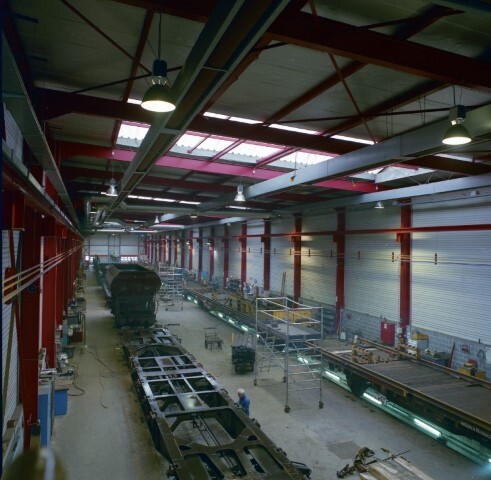 De groep bevat 24 negatieven. Ze tonen hoe de houten vloerplanken van goederenwagens vervangen worden. Een arbeider in blauwe kiel bedient een toestel om vermoedelijk de werking van de remmen van een wagen te testen. Een collega voert met zijn lasapparaat herstellingen uit aan het frame van een platte wagen. Er zijn ook enkele buitenzichten van de werkplaats.