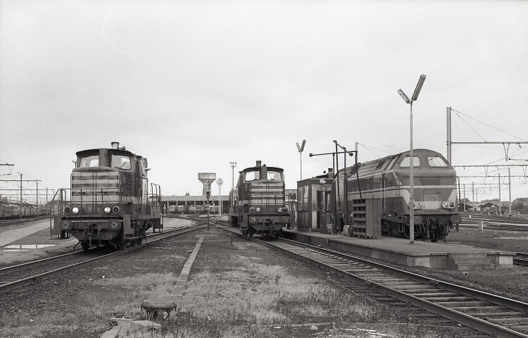 Links zien we twee rangeerlocomotieven uit de reeks 80. Rechts staat diesellocomotief 6079 aan het tankstation van de werkplaats. Op de achtergrond zien we de tractiewerkplaats en daarachter een watertoren.
