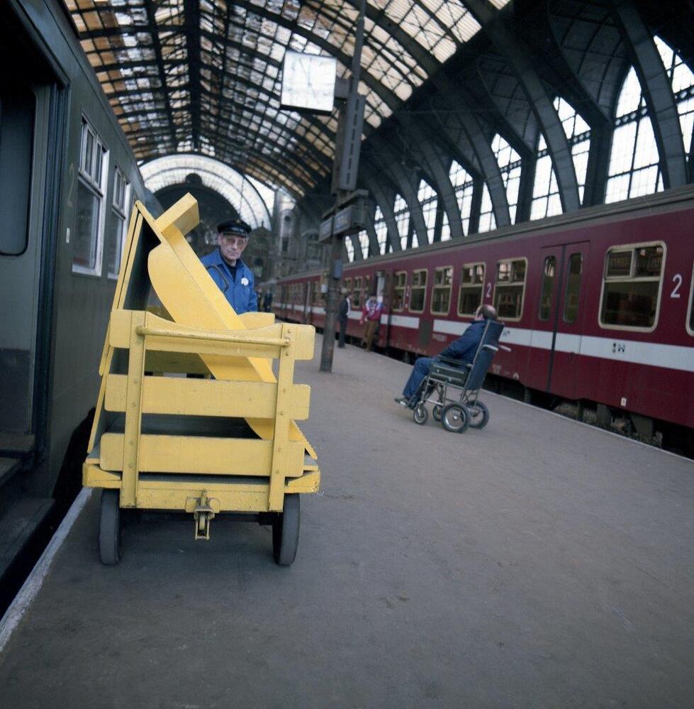 De fotogroep bevat 12 negatieven. Voor reizigers in een rolstoel is het op- en afstappen van een trein niet gemakkelijk. De opnames tonen hoe een reiziger door een NMBS-bediende geholpen wordt bij het opstappen in een M 2-rijtuig. Hierbij wordt gebruik gemaakt van een mobiel platform met aan beide zijden een uitklapbare loopbrug zodat de rolstoel vanop het perron tot op platform van het rijtuig kan worden gereden.
