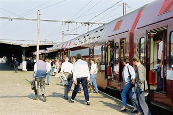 BeschrijvingDeze fotogroep bevat vier negatieven. Reizigers stappen uit een reizigerstrein samengesteld uit bordeaux M 5-rijtuigen. In de achtergrond zien we de luifels over het perron.