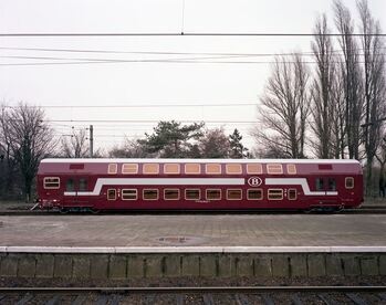 BeschrijvingEen M 5-dubbeldekrijtuig staat aan een perron. Het rijtuig is bordeaux geschilderd met een brede witte band.