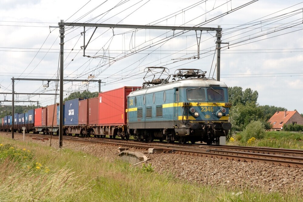 Deze groep bestaat uit drie digitale foto's. Op de foto's zien we een goederentrein op spoorlijn 50 A nabij Hansbeke. De trein bestaat uit platte wagens met containers en wordt gesleept door elektrische locomotief 2345 (reeks 23). De locomotief is blauw geschilder met gele zichtbaarheidsbanden.