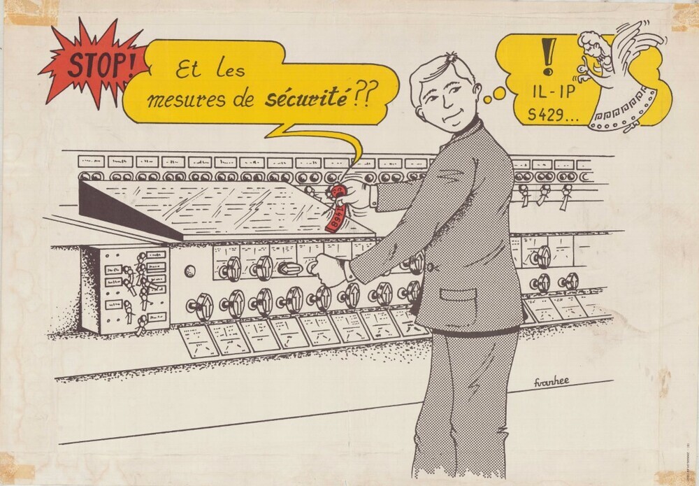 Deze affiche waarschuwt seingevers voor het gevaar dat kan ontstaan door de juiste procedures te negeren. De affiche toont een zwart-witafbeelding van een seingever die de krukken van een elektromechanisch seingestel bedient. De opschriften staan bovenaan in gele en rode tekstballonnen. Bij de laatste tekstballon staat een engel afgebeeld.