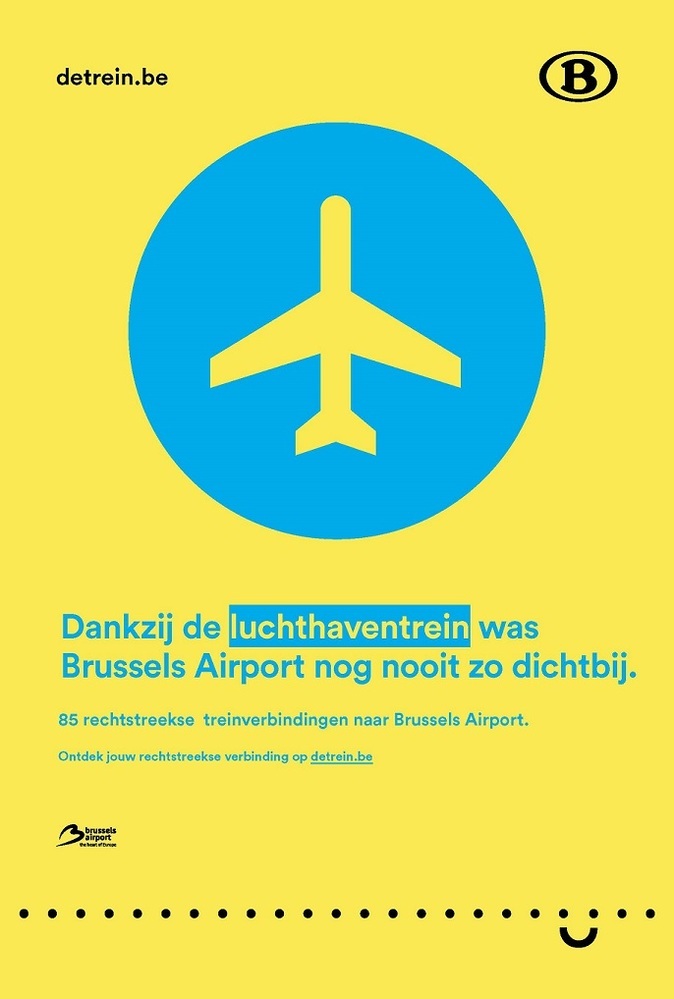'Dankzij de luchthaventrein was Brussels Airport nog nooit zo dichtbij. 85 rechtstreekse treinverbindingen naar Brussels Airport. Ontdek jouw rechtstreekse verbinding op detrein.be' (NMBS)