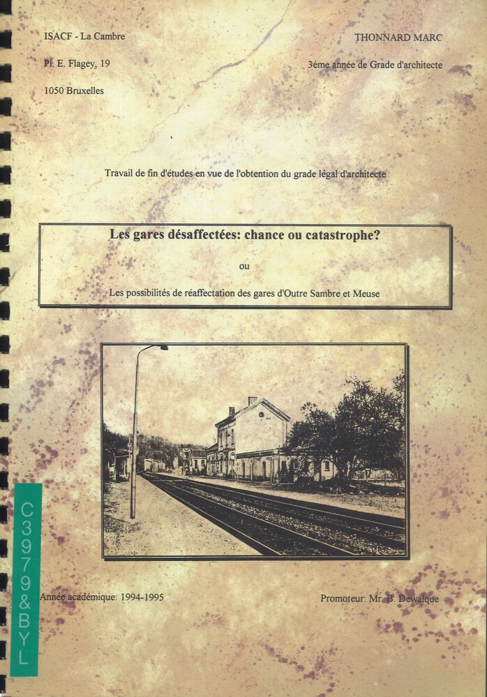 - TitelLes gares désaffectées : chance ou catastrophe ? Ou les possibilités de réaffectation des gares d'Outre Sambre et Meuse. Travail de fin d'études en vue de l'obtention du grade légal d'architecte