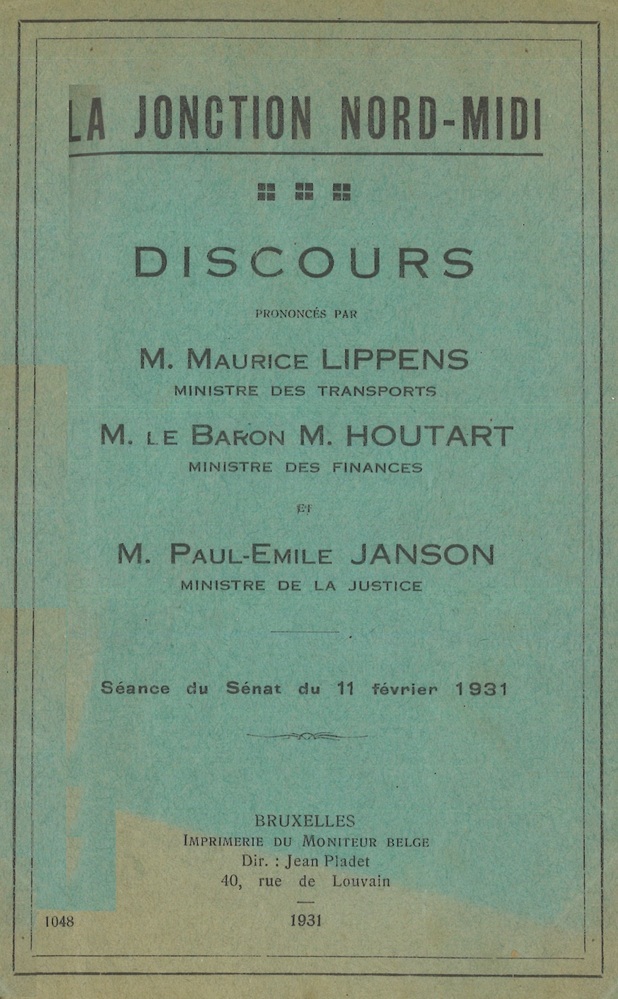 - TitelLa jonction Nord-Midi. Discours prononcés par M. Maurice Lippens, M. Le baron M. Houtart et M. Paul-Emile Janson. Séance du Sénat du 11 février 1931