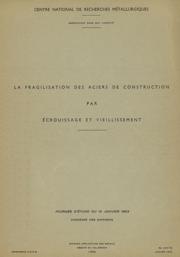 - TitelLa fragilisation des aciers de construction par écrouissage et vieillissement. Journée d'étude du 10 janvier 1963. Condensé des rapports