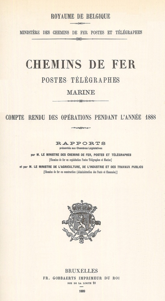 Afbeelding(en): 1 Titel Chemins de fer, postes, télégraphes et marine. Compte rendu des opérations pendant l'année 1888. Rapports présentés aux Chambres législatives Objectnummer BIB_C1066 Plaats van uitgave Brussel Uitgever Jaar van uitgave 1889 Pagina's 205 Afmetingen C