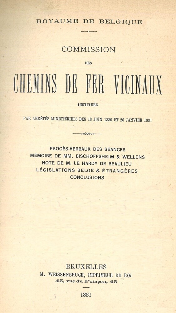 - TitelCommission des Chemins de fer vicinaux instituée par arrêtés ministériels des 18 juin 1880 et 26 janvier 1881. Procès-verbaux des séances. Mémoire de MM. Bisschoffsheim & Wellens. Note de M. Le Hardy de Beaulieu. Législations belge et étrangéres. Conclusions