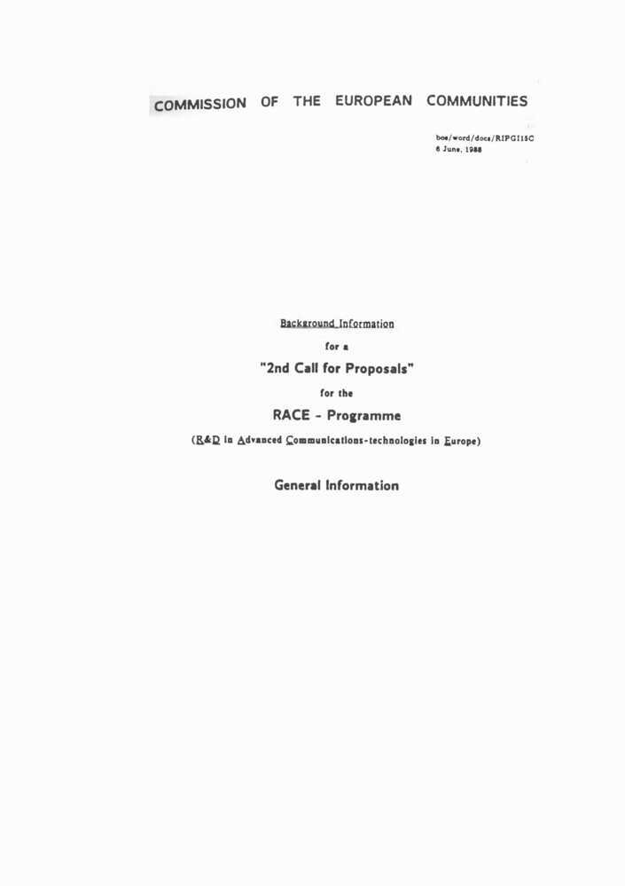 - TitelBackground Information for a "2nd Call for Proposals" for the RACE-Programme (R&D in Advanced Communications-technologies in Europe). General Information. Community rail policy stocktaking and prospects. RACE Workplan '89.OTR200. Volume I & II