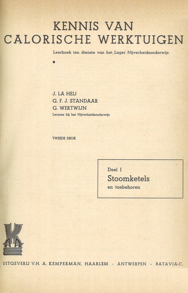 - TitelKennis van calorische werktuigen. Leerboek ten dienste van het lagere nijverheidsonderwijs, door J. La Heij, G.F.J. Standaar & G. Wertwijn. Deel I : Stoomketels en toebehoren