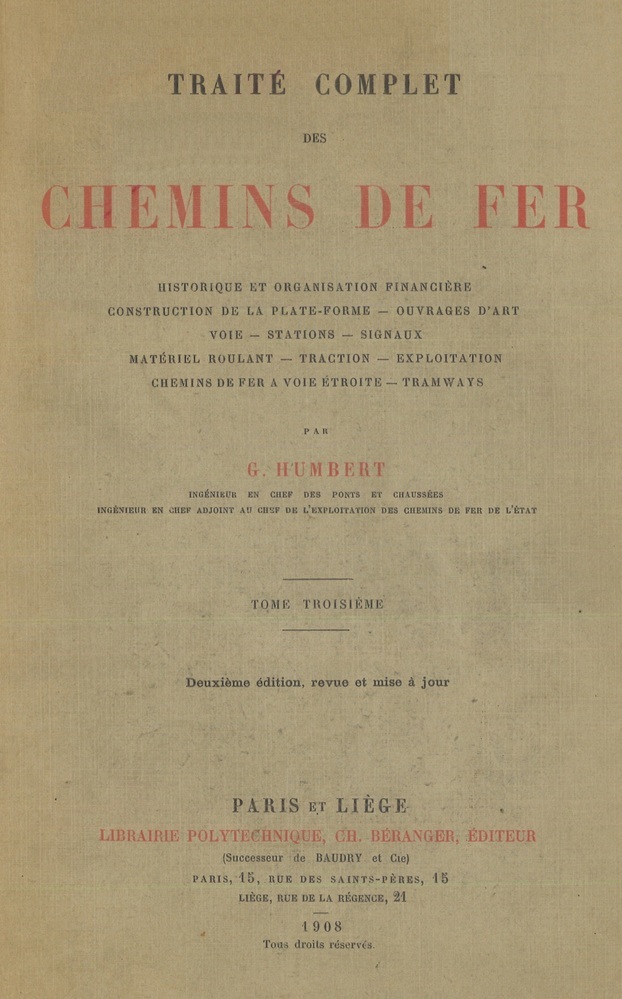 - TitelTraité complet des chemins de fer. Historique et organisation financière. Construction de la plate-forme. Ouvrages d'art. Voies. Stations. Signaux. Materiel roulant. Traction. Exploitation. Chemins de fer à voie étroite. Tramways. Tome III