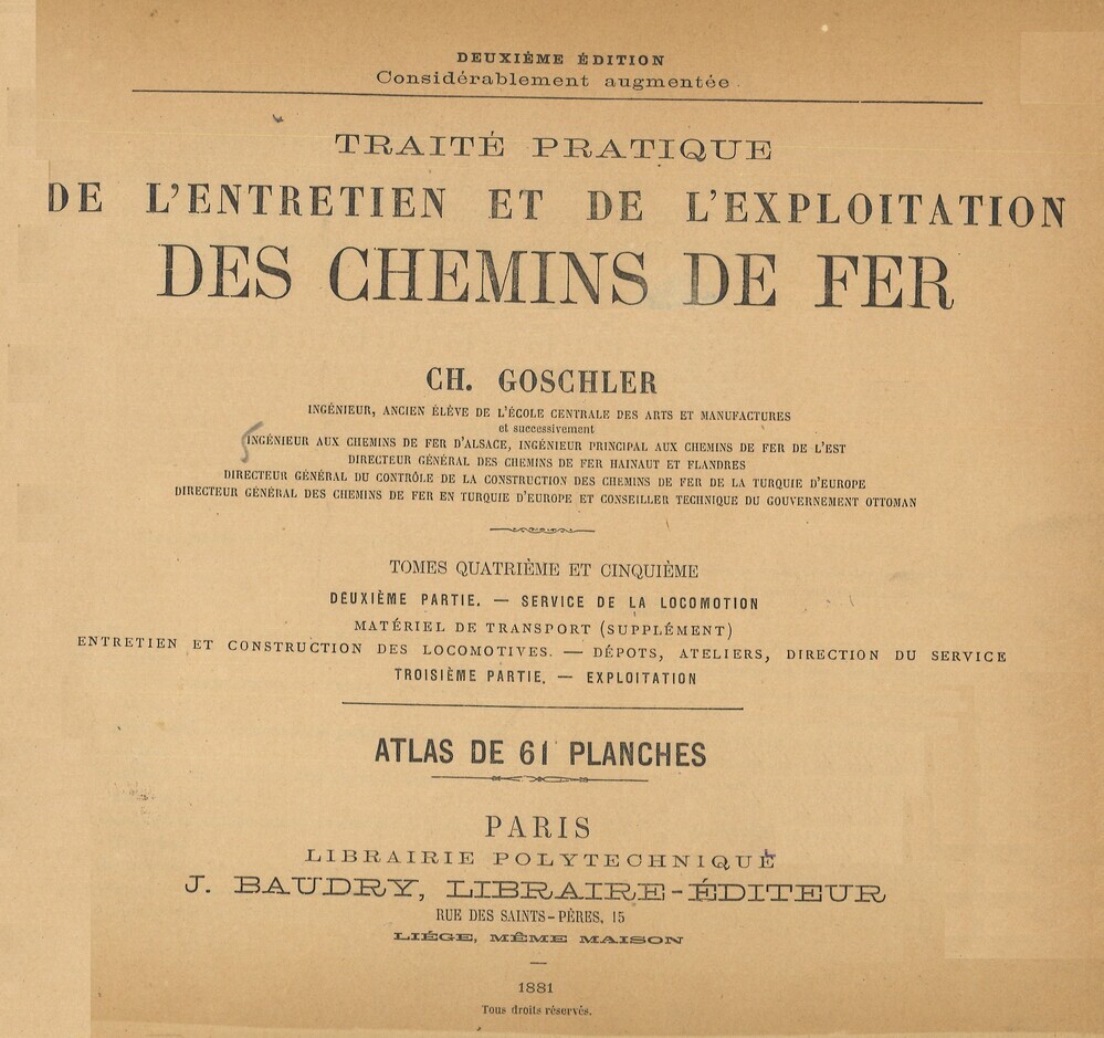 - TitelTraité pratique de l'entretien et de l'exploitation des chemins de fer. Tomes IV et V. 2e Partie. Service de la locomotion. 3e partie. Exploitation. Atlas