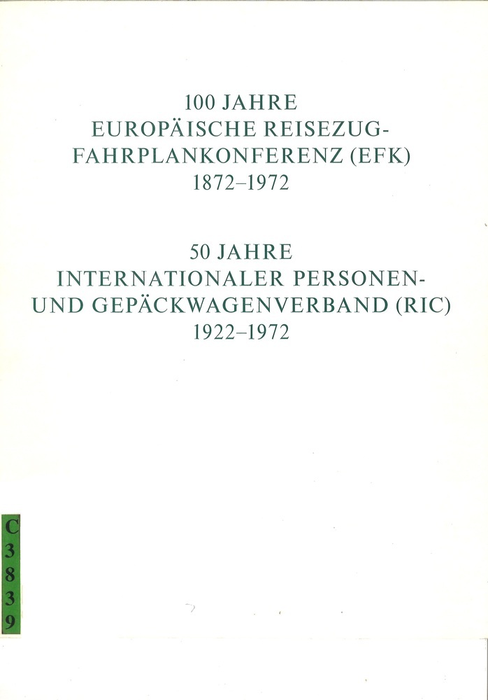 - Titel100 Jahre Europäische Reisezugfahrplankonferenz (EFK) 1872-1972. 50 Jahre Internationaler Personen- und Gepäckwagenverband (RIC) 1922-1972