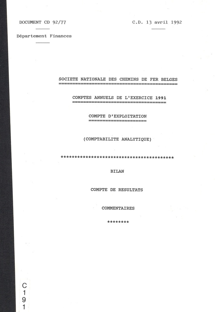 - TitelSociété Nationale des chemins de fer belges. Comptes annuels de l'exercice 1991. Compte d'exploitation. (comptabilité analytique). Bilan. Compte de résultats. Commentaires. Document CD 92/77