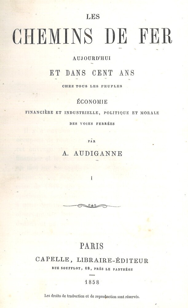 - TitelLes chemins de fer aujourd'hui et dans cent ans chez tous les peuples. Economie financière et industrielle, politique et morale des voies ferrées Tome I