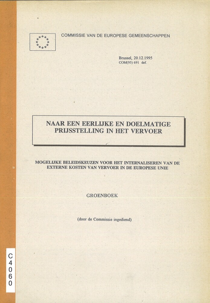 - TitelNaar een eerlijke en doelmatige prijsstelling in het vervoer. Mogelijke beleidskeuzen voor het internaliseren van de externe kosten van vervoer in de Europese Unie. Groenboek (door de Commissie ingediend). Document COM(95) 691 def.