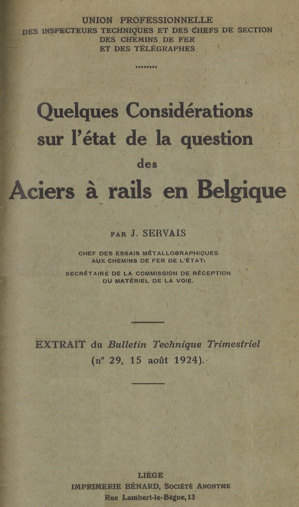 - TitelQuelques considérations sur l'état de la question des aciers à rails en Belgique (Extrait du Bulletin Technique Trimestriel (n°29, 15 août 1924))