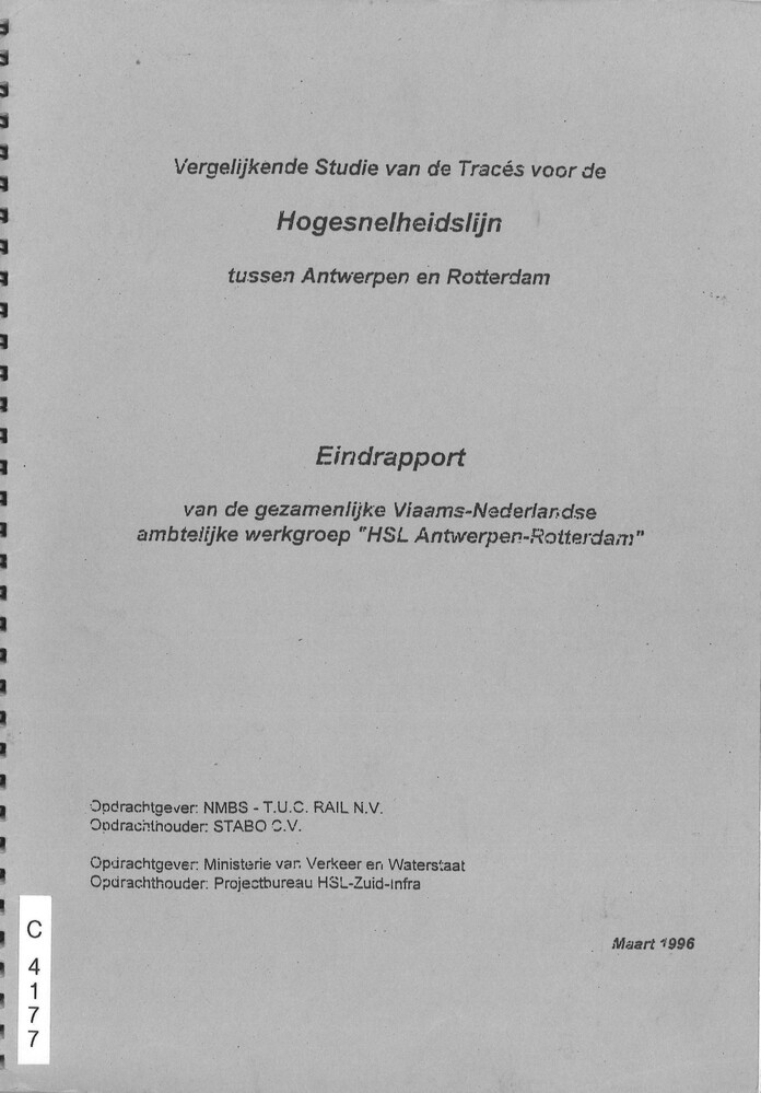 Vergelijkende studie van de tracés voor de hogesnelheidslijn tussen Antwerpen en Rotterdam. Eindrapport van de gezamenlijke Vlaams-Nederlandse ambtelijke werkgroep "HSL Antwerpen-Rotterdam". Kaartenatlas behorende bij de werkdocumenten (bebouwde gebieden en recreatie, landschap, flora en fauna, bodem en water). Kaartenatlas behorende bij hoofdrapport (tracéontwerpkaarten, synthesekaarten effecten)