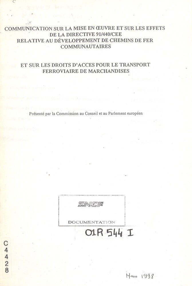 - TitelCommunication sur la mise en oeuvre et sur les effets de la directive 91/440/CEE relative au développement de chemins de fer communautaires et sur les droits d'accès pour le transport ferroviaire de marchandises présenté par la Commission au Conseil et au Parlement européen
