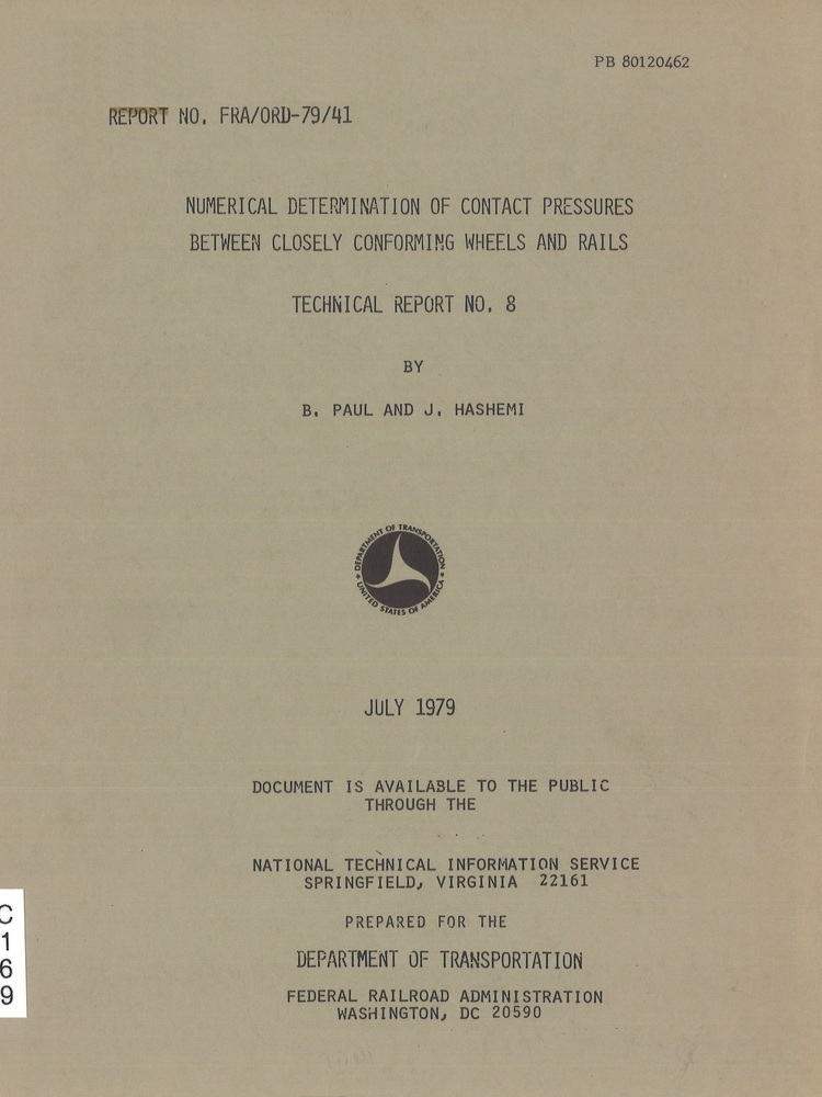 - TitelNumerical determination of contact pressures between closely conforming wheels and rails. Technical report N°8 FRA/ORD-79/41