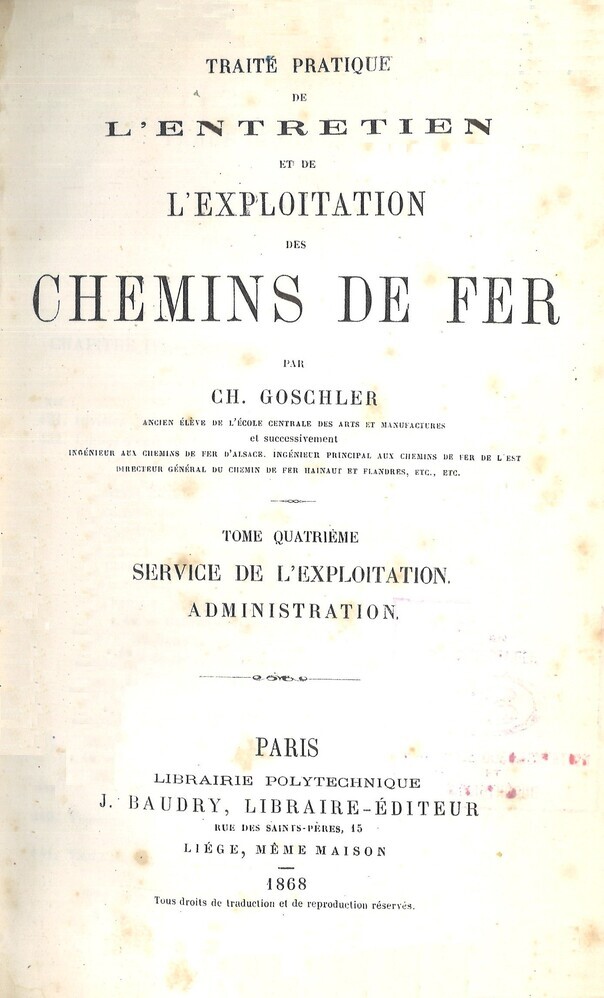 - TitelTraité pratique de l'entretien et de l'exploitation des chemin de fer. Tome IV : Service de l'exploitation. Administration