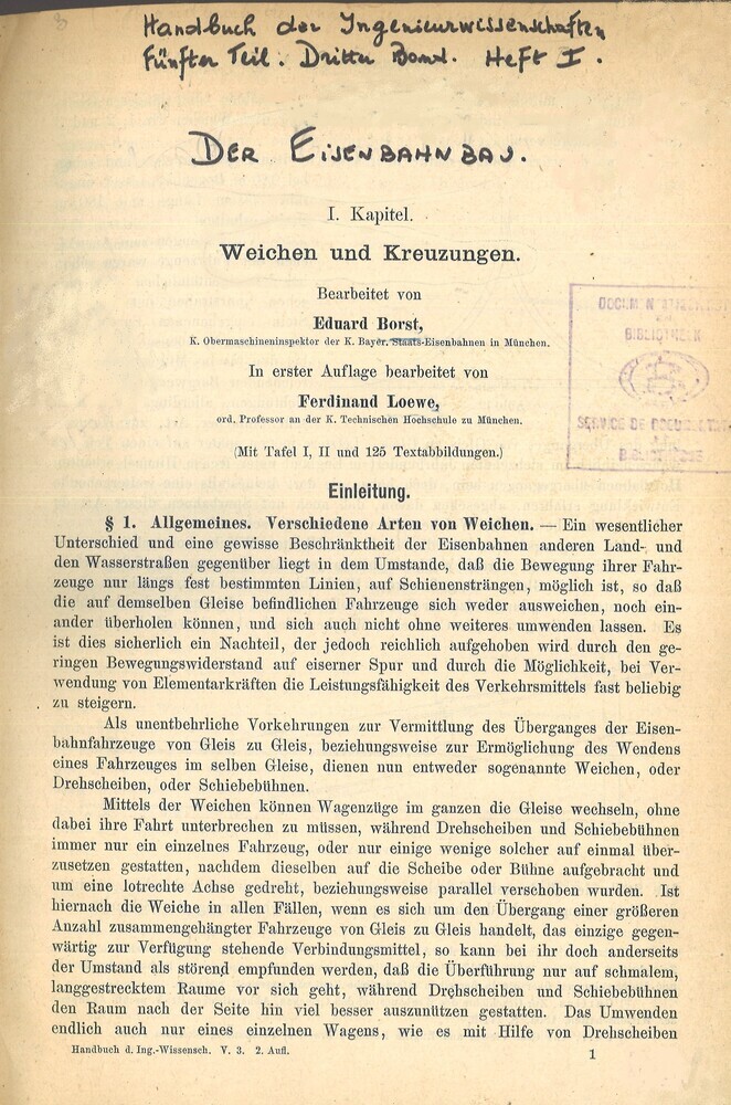 - TitelHandbuch der Ingenieurwissenschaften in fünf Teilen. V. Teil : Der Eisenbahnbau. Ausgenommen Vorarbeiten, Unterbau und Tunnelbau. III. Band. 1. Kapitel : Weichen und Kreuzungen. 2. Kapitel : Drehscheiben und schiebebühnen