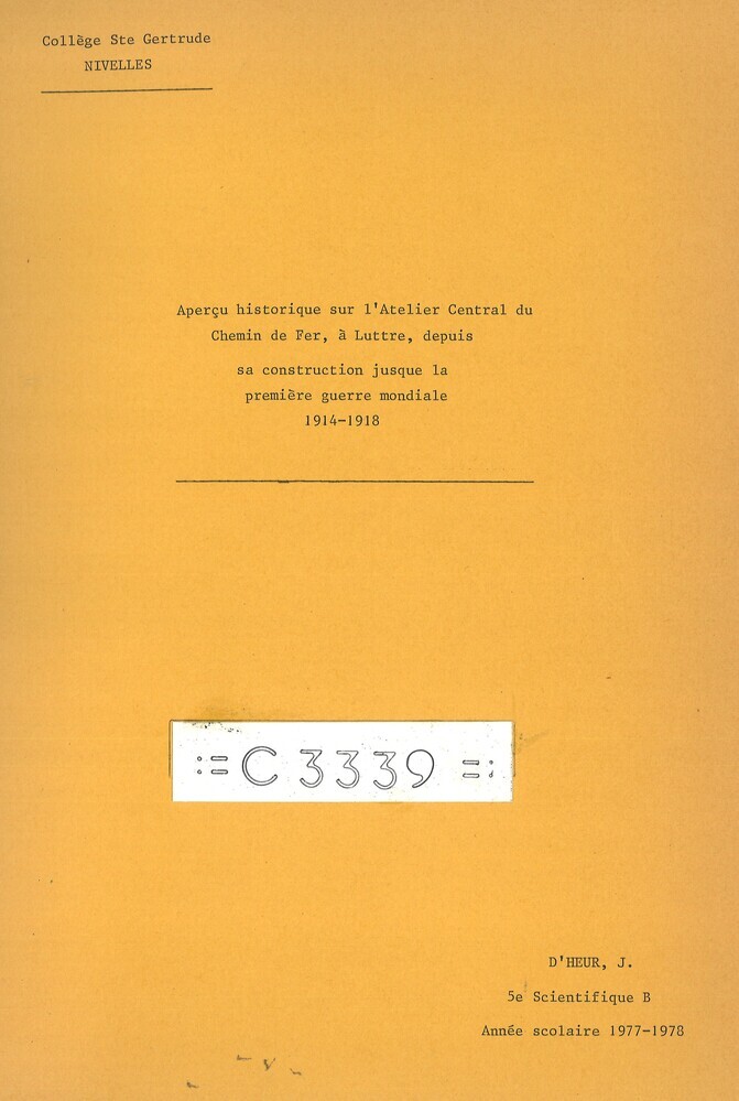 - TitelAperçu historique sur l'Atelier Central du Chemin de Fer, à Luttre, depuis sa construction jusque la première guerre mondiale 1914-1918