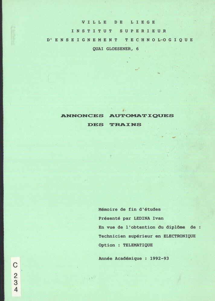 - TitelAnnonces automatiques des trains. Mémoire de fin d'études en vue de l'obtention du diplôme de technicien supérieur en électronique, option télématique