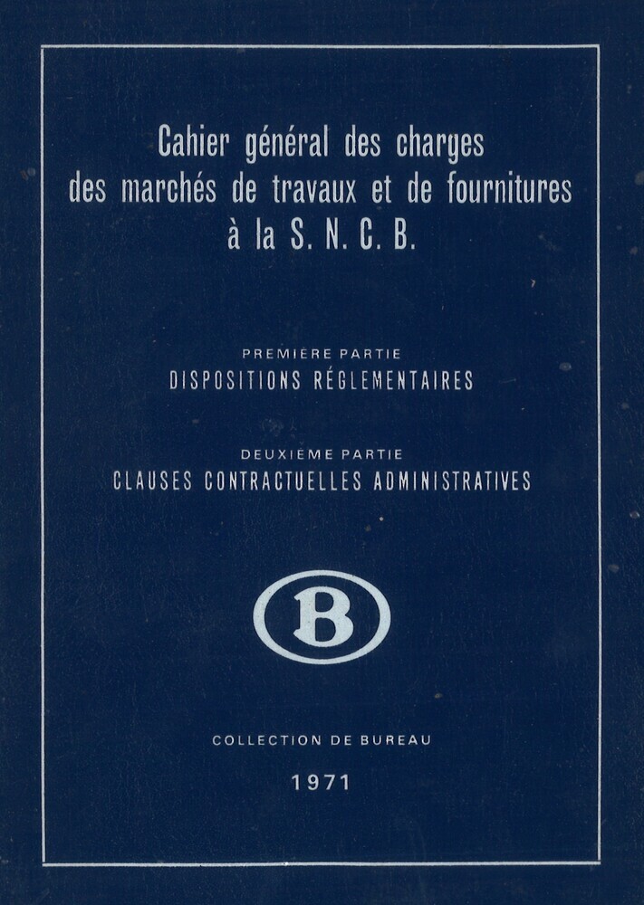 - TitelCahier général des charges des marchés de travaux et de fournitures à la S.N.C.B. Première partie : Dispositions réglementaires. Deuxième partie : Clauses contractuelles administratives
