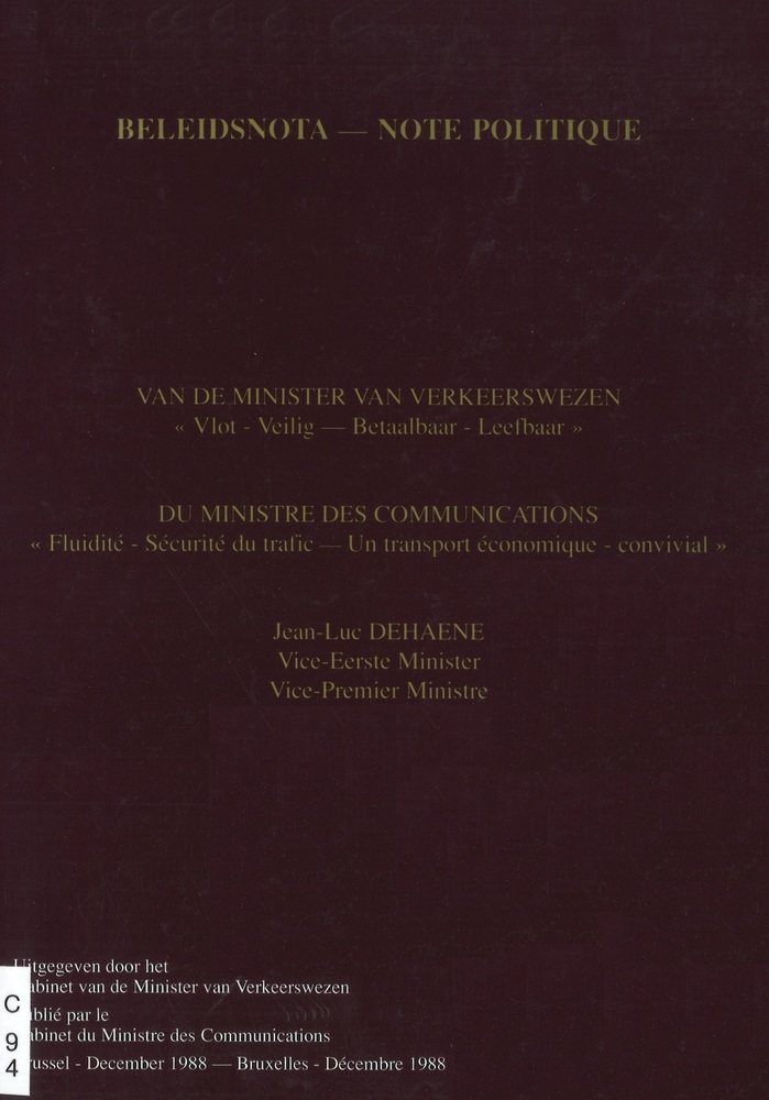 - TitelBeleidsnota van de Minister van Verkeerswezen "Vlot - Veilig - Betaalbaar - Leefbaar". Note politique du Ministre des Communications "Fluidité - Sécurité du trafic - Un transport économique - convivial"