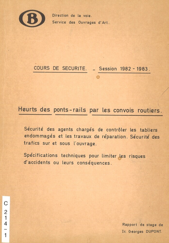 - TitelHeurts des ponts-rails par les convois routiers. Sécurité des agents chargés de contrôler les tabliers endommagés et les travaux de réparation. Sécurité des trafics sur et sous l'ouvrage. Spécifications techniques pour limiter les risques d'accidents ou leurs conséquences. Cours de sécurité