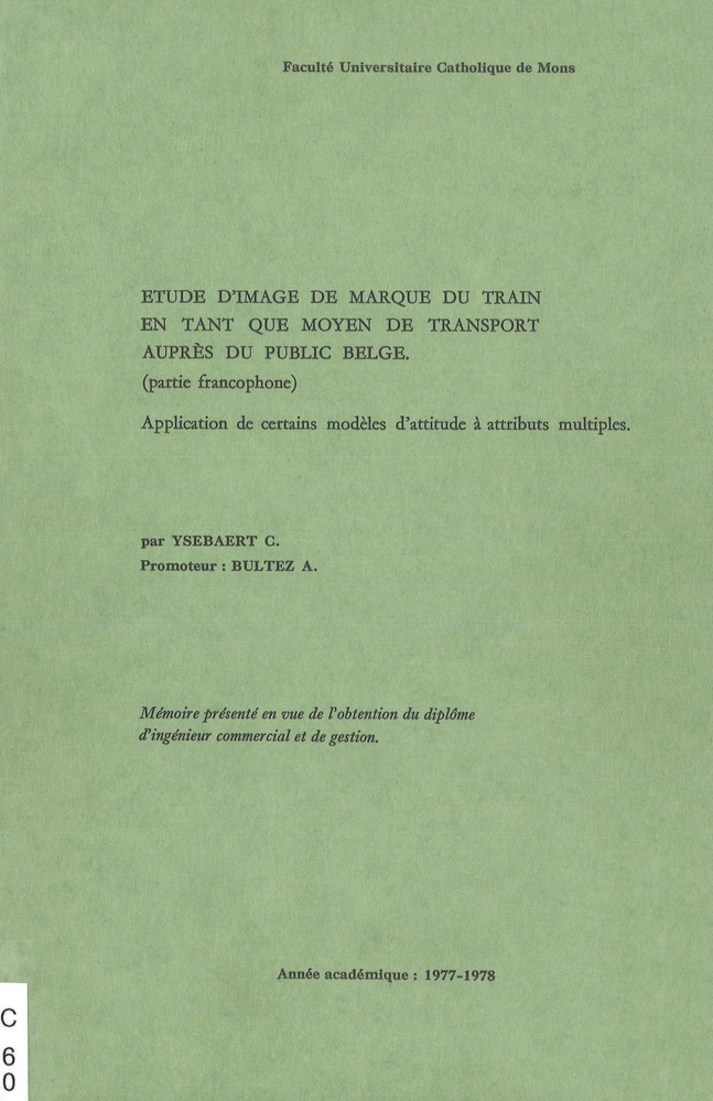 - TitelEtude de l'image de marque du train en tant que moyen de transport auprès du public belge : partie francophone. Application de certains modèles d'attitude à attributs multiples Mémoire présenté en vue de l'obtention du diplôme d'ingénieur commercial et de gestion