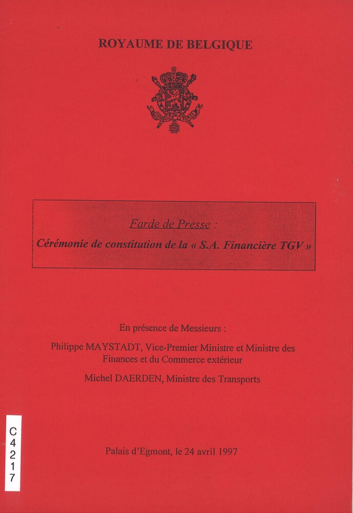 - TitelCérémonie de constitution de la "S.A. Financière TGV". Palais d'Egmont, le 24 avril 1997. En présence de Messieurs : Philippe MAYSTADT, Vice-Premier Ministre et Ministre des Finances et du Commerce extérieur; Michel DAERDEN, Ministre des Transports. Farde de presse