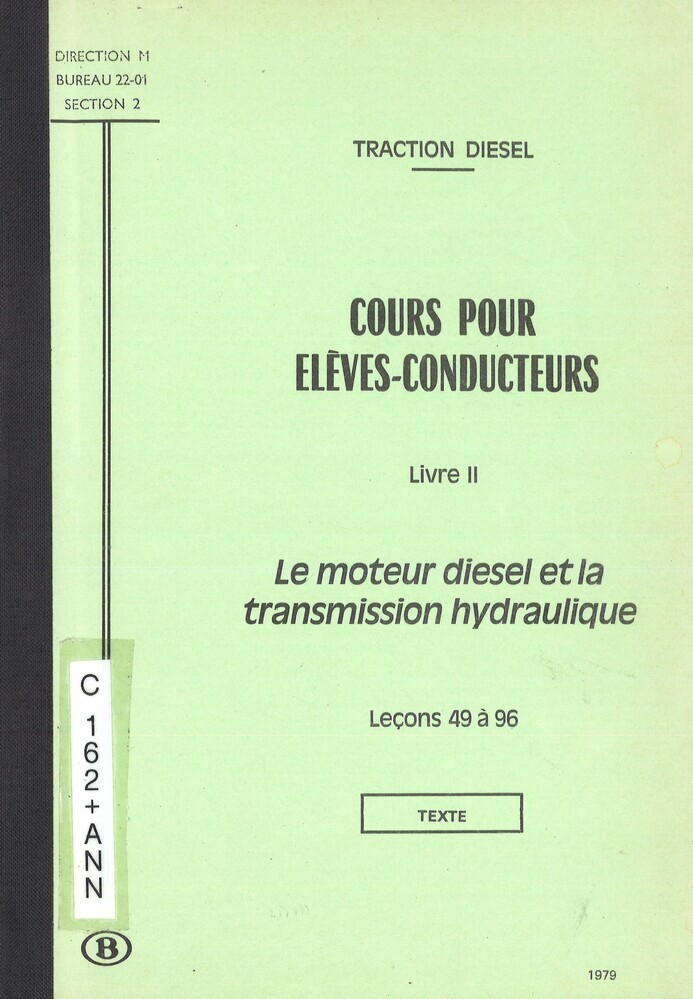 - TitelCours pour élèves-conducteurs. 122.50. Traction diesel. Livre II. Leçons 49 à 96. Le moteur diesel et la transmission hydraulique. Texte. Planches