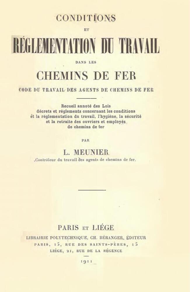 - TitelConditions et réglementation du travail dans les chemins de fer. Code du travail des agents de chemins de fer. Recueil annoté des lois, décrets et règlements concernant les conditions et la réglementation du travail, l'hygiène, la sécurité et la retraite des ouvriers et employés de chemin de fer