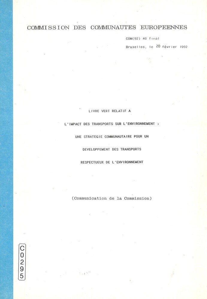 - TitelLivre vert relatif a l'impact des transports sur l'environnement: : une stratégie communautaire pour un développement des transports respectueux de l'environnement. COM(92) 46 final