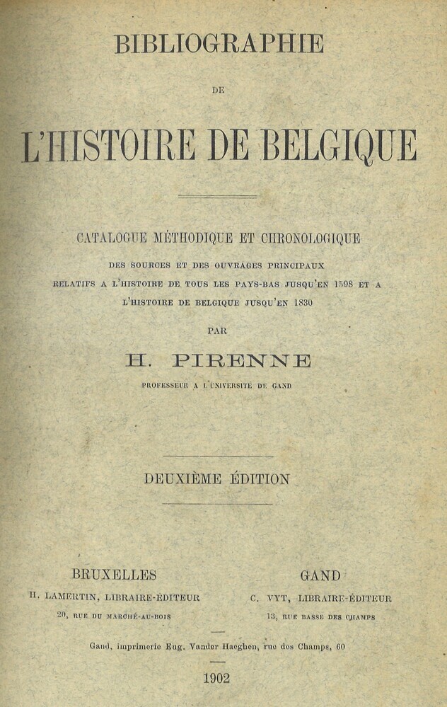 - TitelBibliographie de l'histoire de Belgique. Catalogue méthodique et chronologique des sources et des ouvrages principaux relatifs à l'histoire de tous les Pays-Bas jusqu'en 1598 et à l'histoire de Belgique jusqu'en 1830