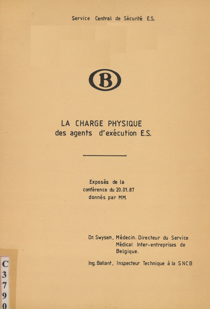 - TitelLa charge physique des agents d'exécution E.S.. Exposés de la conférence du 20.01.87 donnés par MM. Dr. Swysen, Médecin. Directeur du Service Médical Inter-entreprises de Belgique et Ing. Ballant, Inspecteur Technique à la SNCB