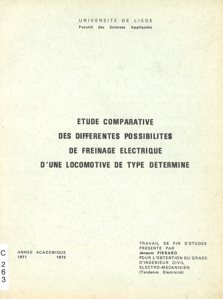 - TitelEtude comparative des différentes possibilités de freinage électrique d'une locomotive de type déterminé. Travail de fin d'études présenté pour l'obtention du grade d'ingénieur civil éléectro-mécanicien (tendance électricité)