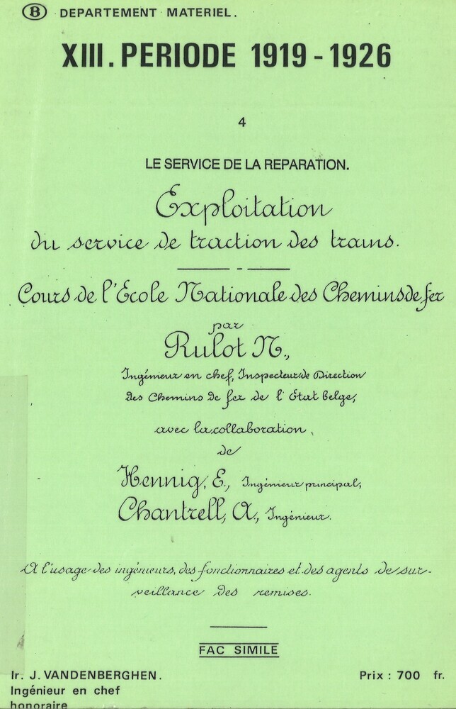 - TitelXIII. Période 1919-1926. 4. Le service de la réparation. Fac-similé : "Exploitation du Service de traction des trains. Cours de l'Ecole Nationale des Chemins de Fer par M. Rulot, E. Henning et A. Chantrell, 1923"