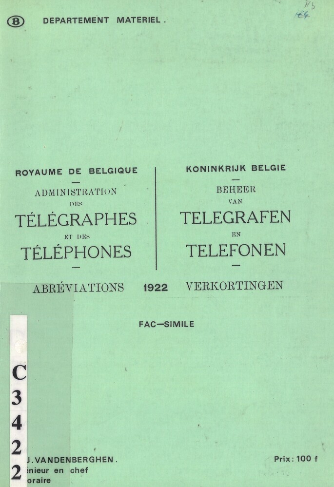 - TitelFac-similé : "Abréviations de l'Administration des télégraphes et des téléphones / Verkortingen van het Beheer van telegrafen en telefonen, 1922"