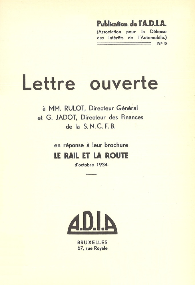 - TitelLettre ouverte à MM.Rulot, Directeur Général et G.Jadot, Directeur des Finances de la S.N.C.F.B. en réponse à leur brochure Le rail et la route d'octobre 1934