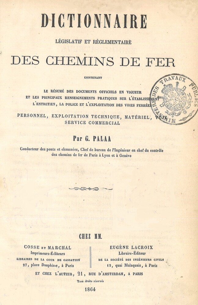 Dictionnaire législatif et réglementaire des chemins de fer contenant le résumé des documents officiels en vigueur et les principaux renseignements pratiques sur l'établissement, l'entretien, la police et l'exploitation des voies ferrées. Personnel; exploitation technique, matériel, voie, service commercial