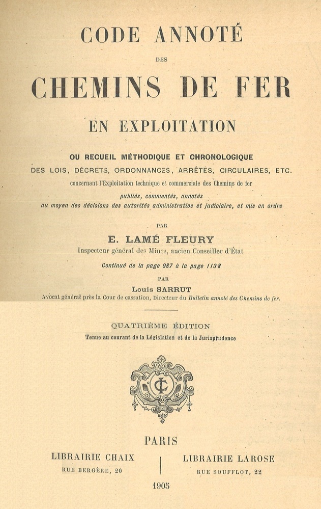 - TitelCode annoté des chemins de fer en exploitation. ou recueil méthodique et chronologique des lois, décrets, ordonnances, arrêtés, circulaires, etc